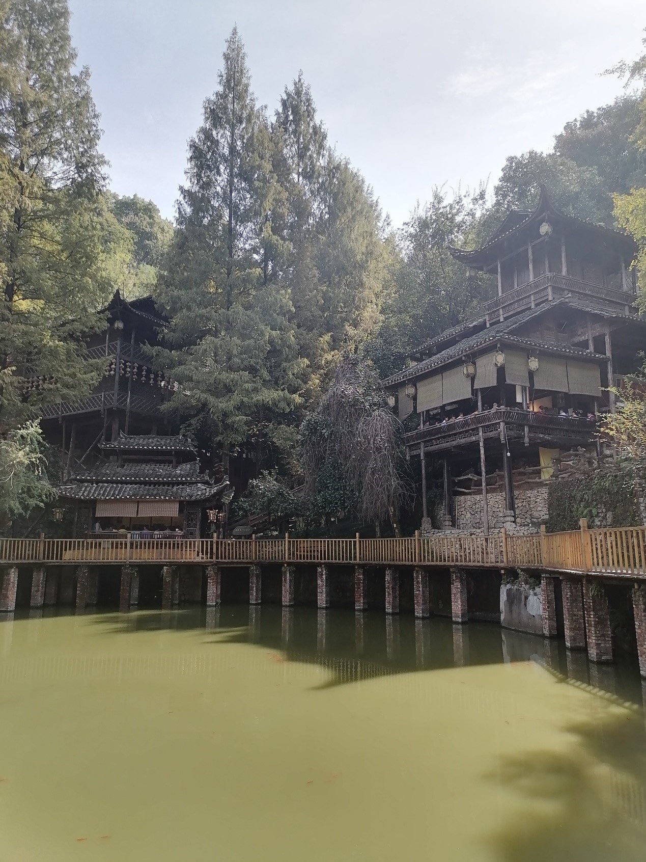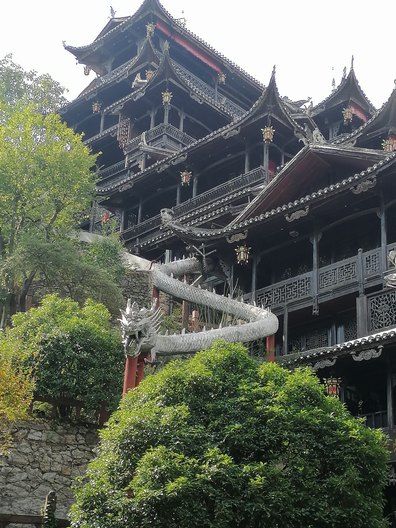 第四天大家先游览了张家界土司城,这是一个民俗风情主题公园,原为永定土司城,是一座古老的土家山寨。这是全国最大最高的木质结构吊脚楼,这个吊脚楼依山而建,气势恢宏,楼高48米,共九重十二层,整栋楼没有一颗铁钉,堪称土家族建筑史上的奇迹。