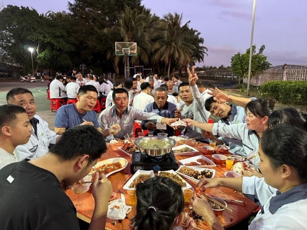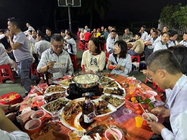 游戏完成,饥肠辘辘,年餐的重头戏当然是大口喝酒、大口吃肉的狂吃模式。公司为员工准备了暖暖的羊肉汤、酸甜可口的糖醋鱼、美味的炒粉等等美食。