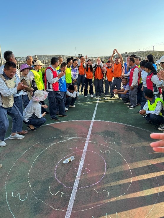 第三个游戏为“滚水得分”,我们划分了三个得分区域,分别是10分、5分、3分。看到大家滚到高分,一个个举手欢呼的样子,每个人都成了可爱的“大孩子”。